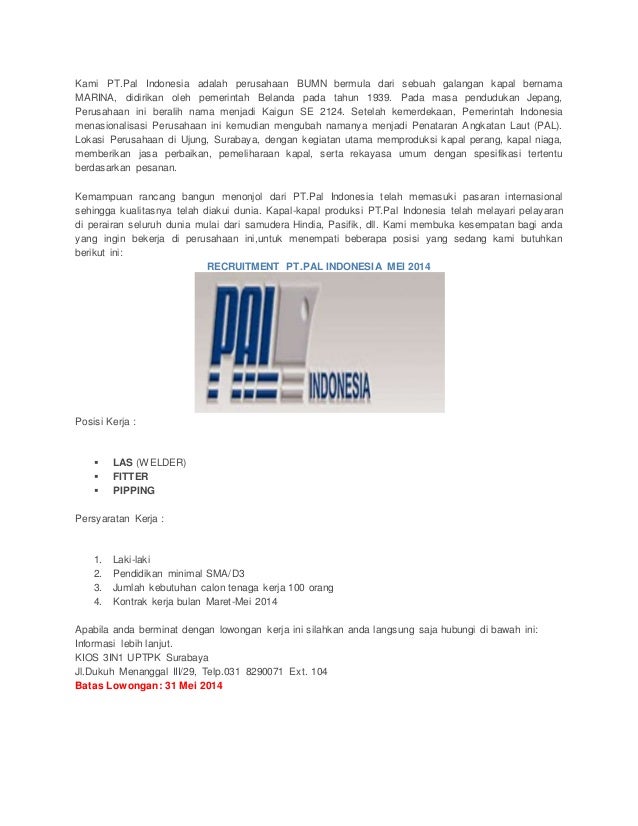Alamat Pt Pal Surabaya Arif rahman hakim no.93, klampis ngasem, kec. Pt king koil international indonesia. Pt.pal indonesia (persero),bumn ujung surabaya po.box.1134 ujung semampir kota surabaya jawa timur indonesia code pos 60155 hanya pelamar yang memenuhi kualifikasi yang akan kami proses. Jurusan / kompetensi keahlian dan akreditasi :