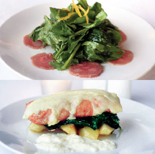 Set menu 99k english spinach salad duck confit with potato gratin pineapple pannacotta.