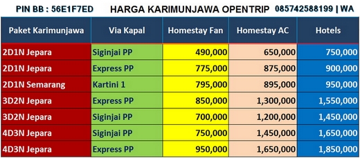 Kami juga memberikan informasi terupdate harga tiket kapal siginjai dan express, tarif penyebrangan, hingga biaya paket wisata karimunjawa, dapat anda akses disitus ini.