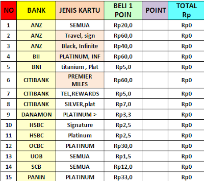 Untuk melihat nilai penukaran dari berbagai poin kartu kredit dari berbagai bank tersebut, lihat di bawah ini