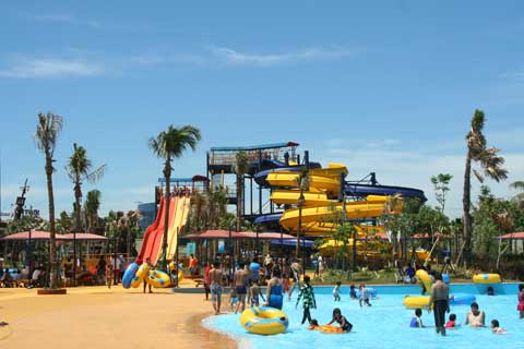 Taman bernuansa hawaii dengan seluncuran & wisata air, tempat makan, bar.